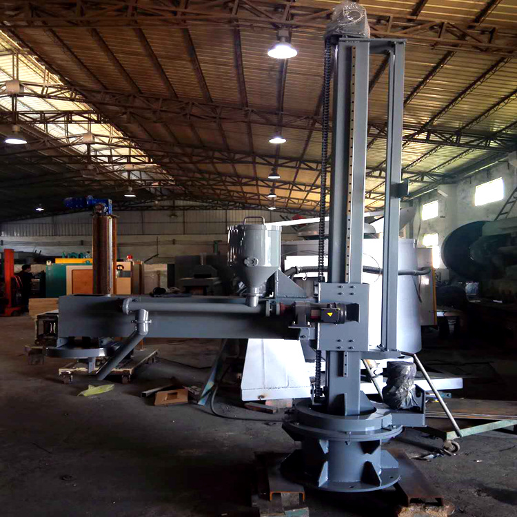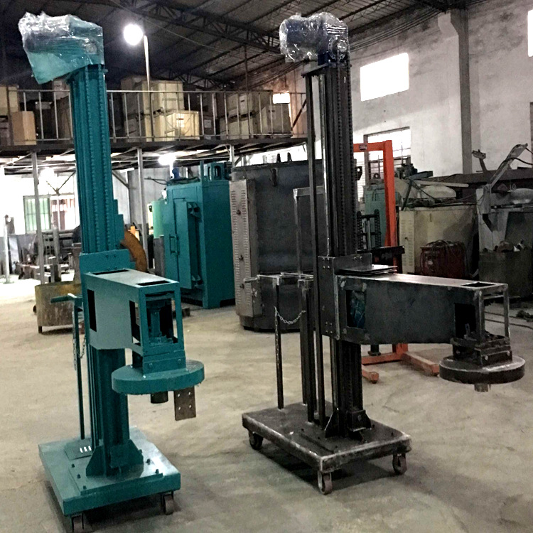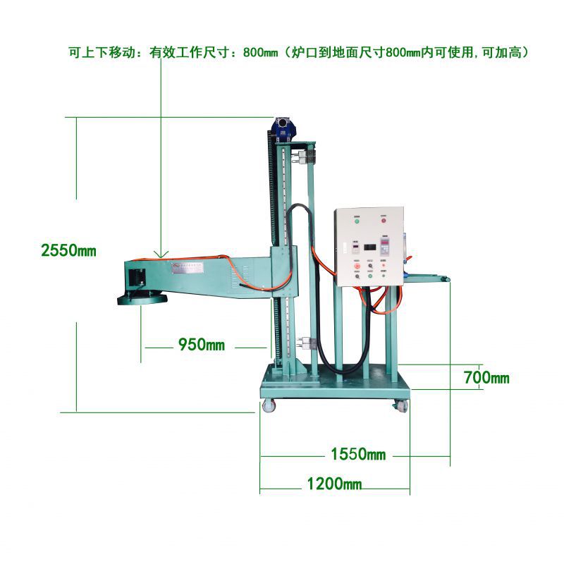 固定式鋁液精煉除氣機屬于鋁合金溶液精煉除氣設(shè)備中的一種,特點是固定放置在坩堝爐上或旁邊,搖臂可固定手動或電動旋轉(zhuǎn),石墨棒對準(zhǔn)鋁液中心后,開啟升降機構(gòu),石墨棒進入鋁液中適當(dāng)深度,再打開攪拌和氮氣開關(guān),一邊旋轉(zhuǎn)一邊通氮氣或氬氣,即將鋁液里面的氫氣除掉,且把渣子攪拌至鋁液表面。可根據(jù)用戶需要加裝自動噴粉裝置。