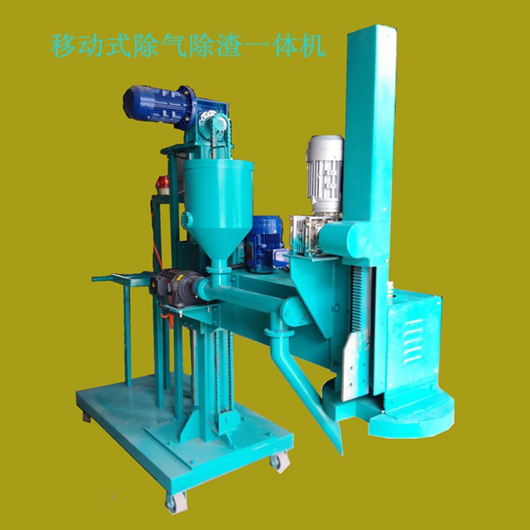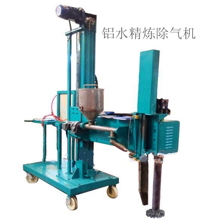 移動式鋁液精煉除氣機屬于鋁合金溶液精煉除氣設(shè)備中的一種,特點是可移動,供多臺熔爐輪流使用,使用效率高。工作中可手推移動到坩堝爐、中轉(zhuǎn)包、熔池旁邊,石墨棒對準(zhǔn)鋁液中心后,開啟升降機構(gòu),石墨棒進入鋁液中適當(dāng)深度,再打開攪拌和氮氣開關(guān),一邊旋轉(zhuǎn)一邊通氮氣或氬氣,即將鋁液里面的氫氣除掉,且把渣子攪拌至鋁液表面。可根據(jù)用戶需要加裝自動噴粉裝置。