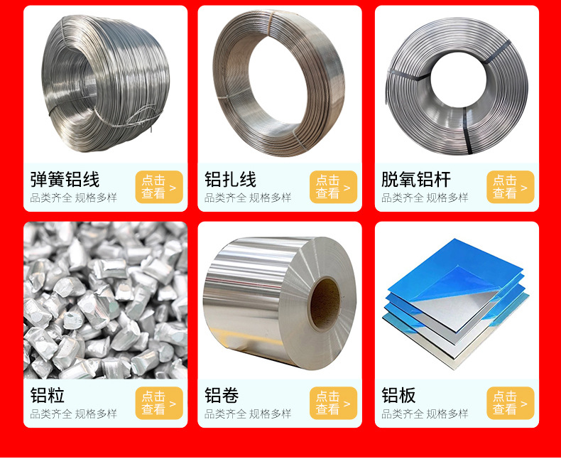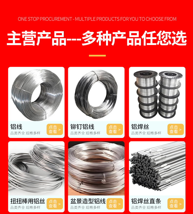 主要產品包括1060鋁線、鋁扎線、鉚釘鋁線、彈簧鋁線、扭扭棒用鋁絲、盆景造型鋁線、鋁桿、鋁粒、鋁板、花紋鋁板、鋁卷等。